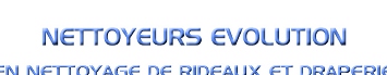 AVEC PLUS DE 25 ANS D'EXPERIENCE DANS L'INDUSTRIE DE NETTOYAGE COMMERCIALE, INSTITUTIONELLE ET RESIDENTIELLE, LES NETTOYEURS EVOLUTION ONT MAINTENANT LA TECHNOLOGIE POUR ENTREPRENDRE TOUT PROJET DE NETTOYAGE. NOTRE NOUVEAU SYSTEME DE NETTOYAGE A SEC NOUS PERMET DE NETTOYER VOS DRAPERIES, RIDEAUX ET AUTRES PARRURES DE FENETRES EN TISSU LA OU ILS SONT ACCROCHES....SUR PLACE. NOTRE TECHNOLOGIE ET METHODES DE NETTOYAGE MODERNES NOUS PERMETTENT D'OFFRIR UN SERVICE COMPLET DE NETTOYAGE. NOUS OFFRONS UNE HAUTE QUALITE ET UN SERVICE EFFICACE ET AUX PRIX TRES COMPETITIFS. NOS NORMES DE SOIN SONT AU-DESSUS DES NORMES D'INDUSTRIE. NOTRE CONTROLE DE QUALITE EST TRES RIGOUREUX. NOUS SOMMES SURS DE VOUS LAISSER SATISFAIT. NOUS OFFRONS UN SERVICE DE 24 HEURES SUR 24, 7 JOURS SUR 7, AFIN DE NOUS ADAPTER MIEUX A VOTRE HORAIRE. NOUS OFFRONS TOUJOURS LES METHODES TRADITIONNELLES DE NETTOYAGE DE VOS RIDEAUX, OU ON LES DECROCHE, LES NETTOYE ET ONS LES ACCROCHE APRES LA LIVRAISONS. NOTRE USINE EST SITUEE AU COEUR DE LA VILLE DE MONTREAL ET NOUS AVONS UN DELAI DE LIVRAISON DE 24 HEURES. NOUS VISONS A NOUS DEPASSER POUR VOUS LAISSER SATISFAIT |